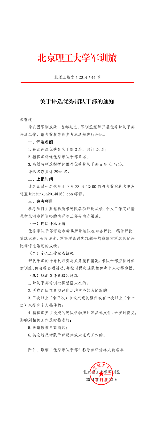 北理工旅发〔2014〕44号:关于评选优秀带队干部的通知
