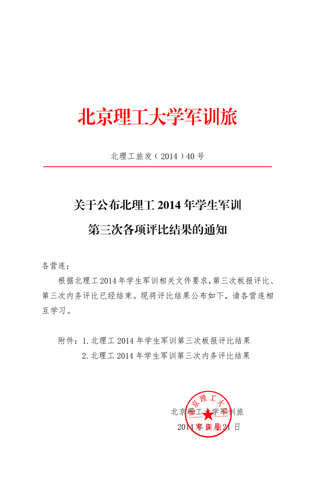 北理工旅发〔2014〕40号:关于公布北理工2014年学生军训第三次各项评比结果的通知