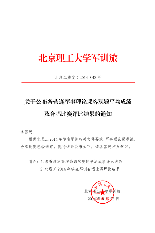 北理工旅发〔2014〕42号:关于公布各营连军事理论课客观题平均成绩及合唱比赛评比结果的通知