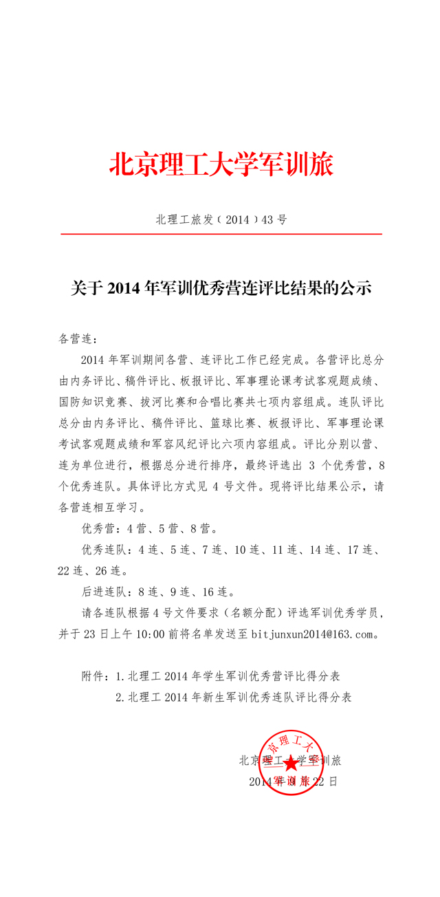 北理工旅发〔2014〕43号:关于2014年军训优秀营连评比结果的公示