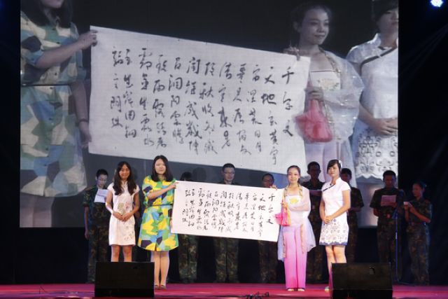 “天地玄黄,宇宙洪荒”,深情的朗诵、婀娜的舞姿、空灵的琴声和遒劲的墨笔将在场观众引入中华传统文化圣地。传统文化教育是2014级新生入学教育的重要环节之一,迎新当天的传统名篇朗诵和军训期间多次开展的传统文化教育让参训学员将中华优秀传统文化内化于心,并以精彩的《文•艺颂》向传统致敬。