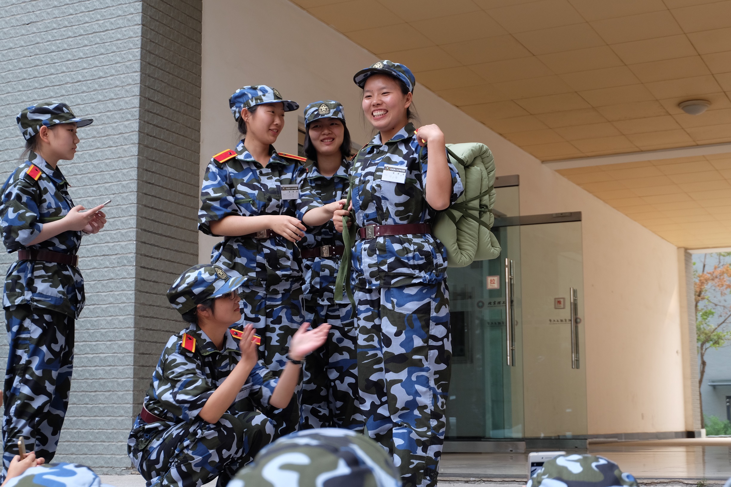 第一次学习打背包,笑容是我们不畏艰难的见证。(摄影:17连)