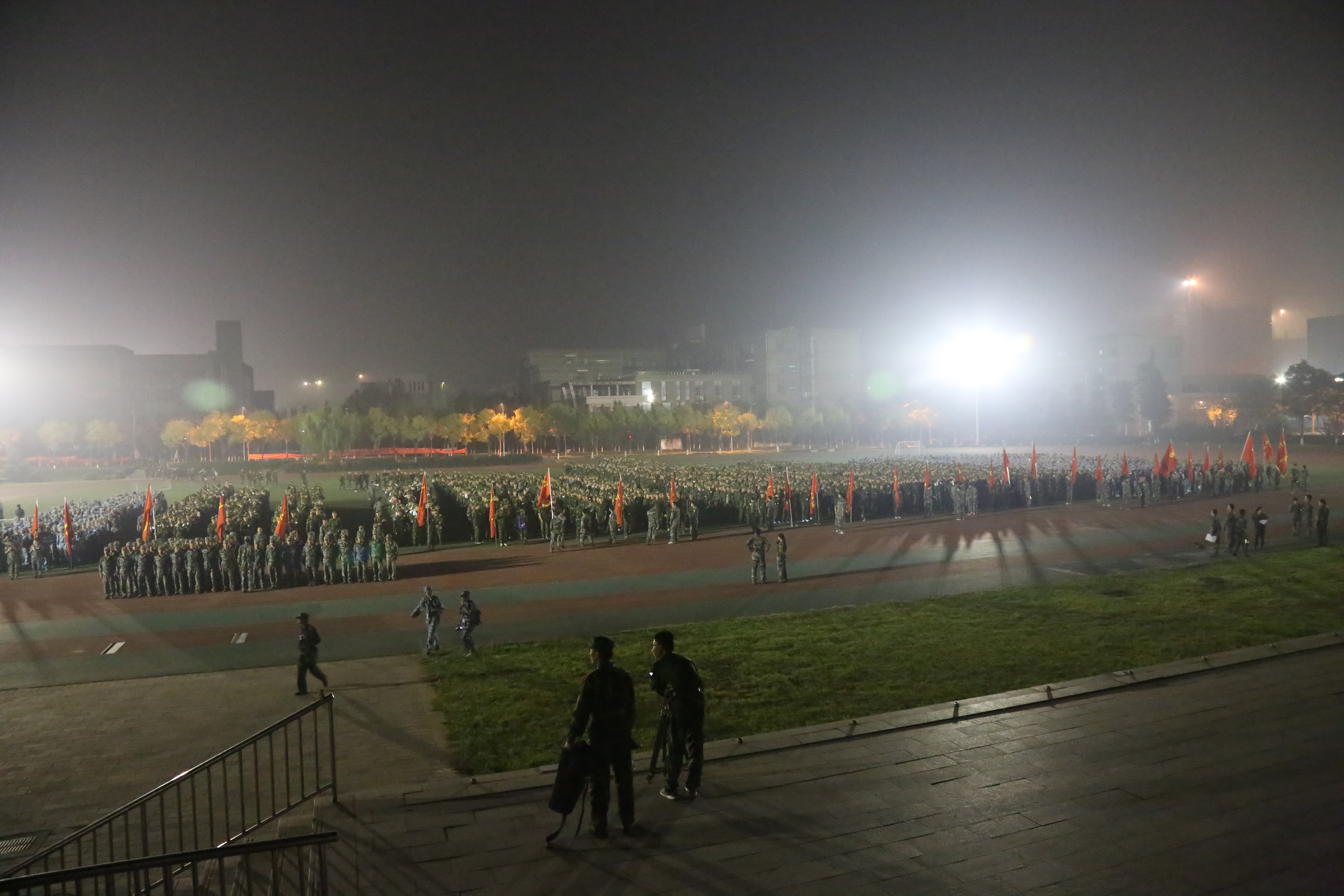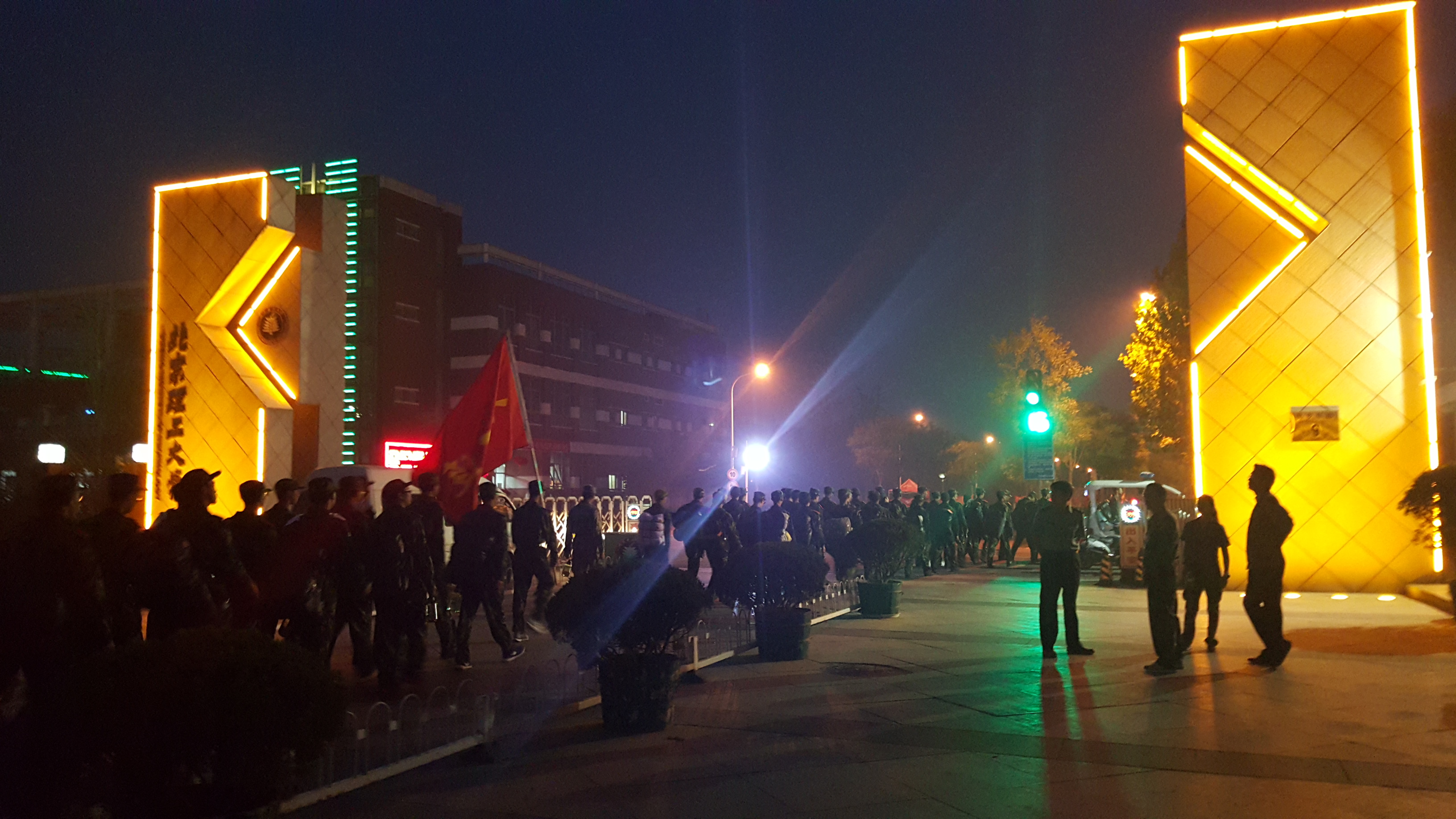 出发!旗手举旗,即使在黑暗中,我们的队伍依旧整齐。(摄影:11连)
