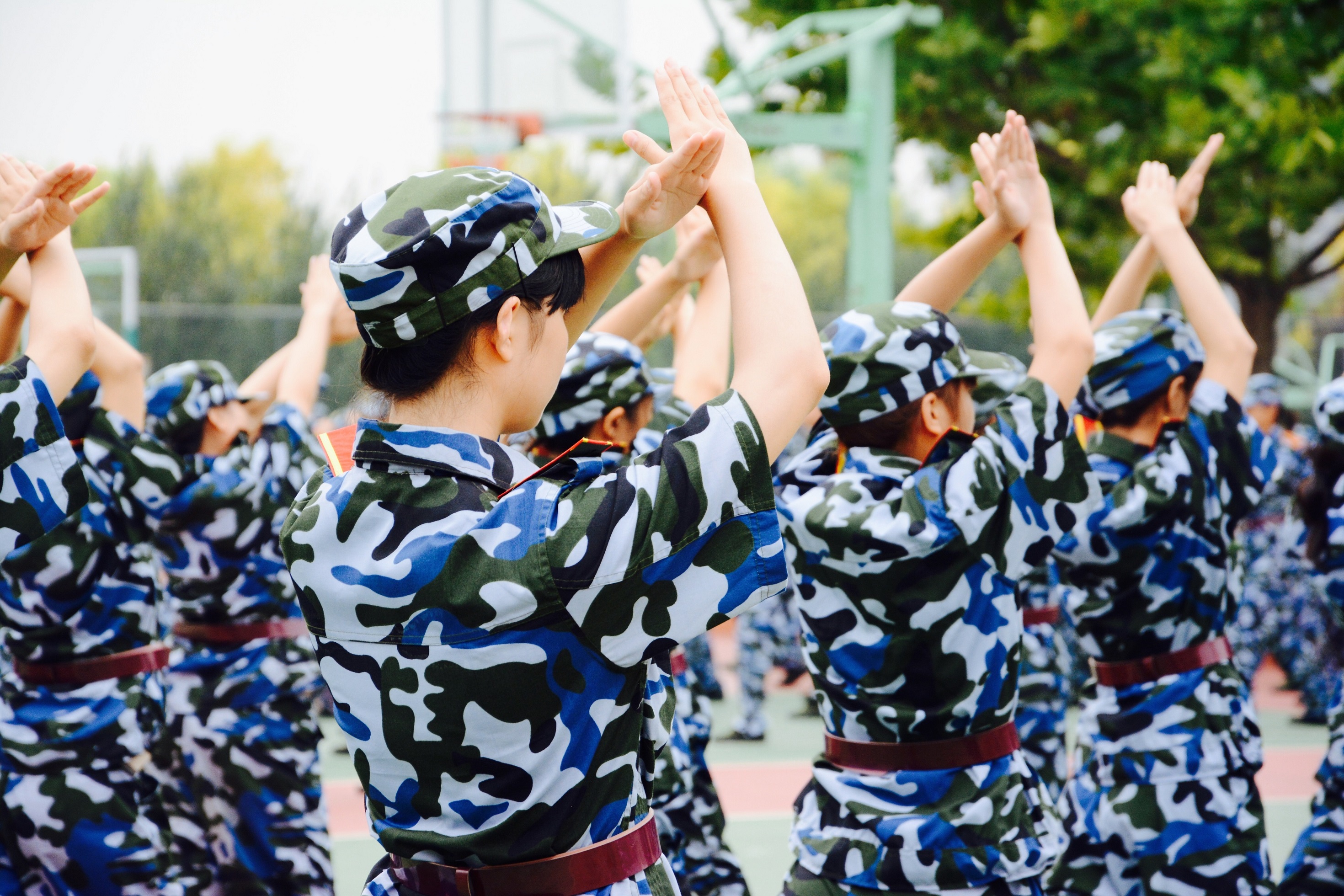 听,嘹亮的口号在空中回响;看,铿锵玫瑰迈着有力的步伐。绿荫树下展英姿,不输男儿我最强。(摄影:18连)