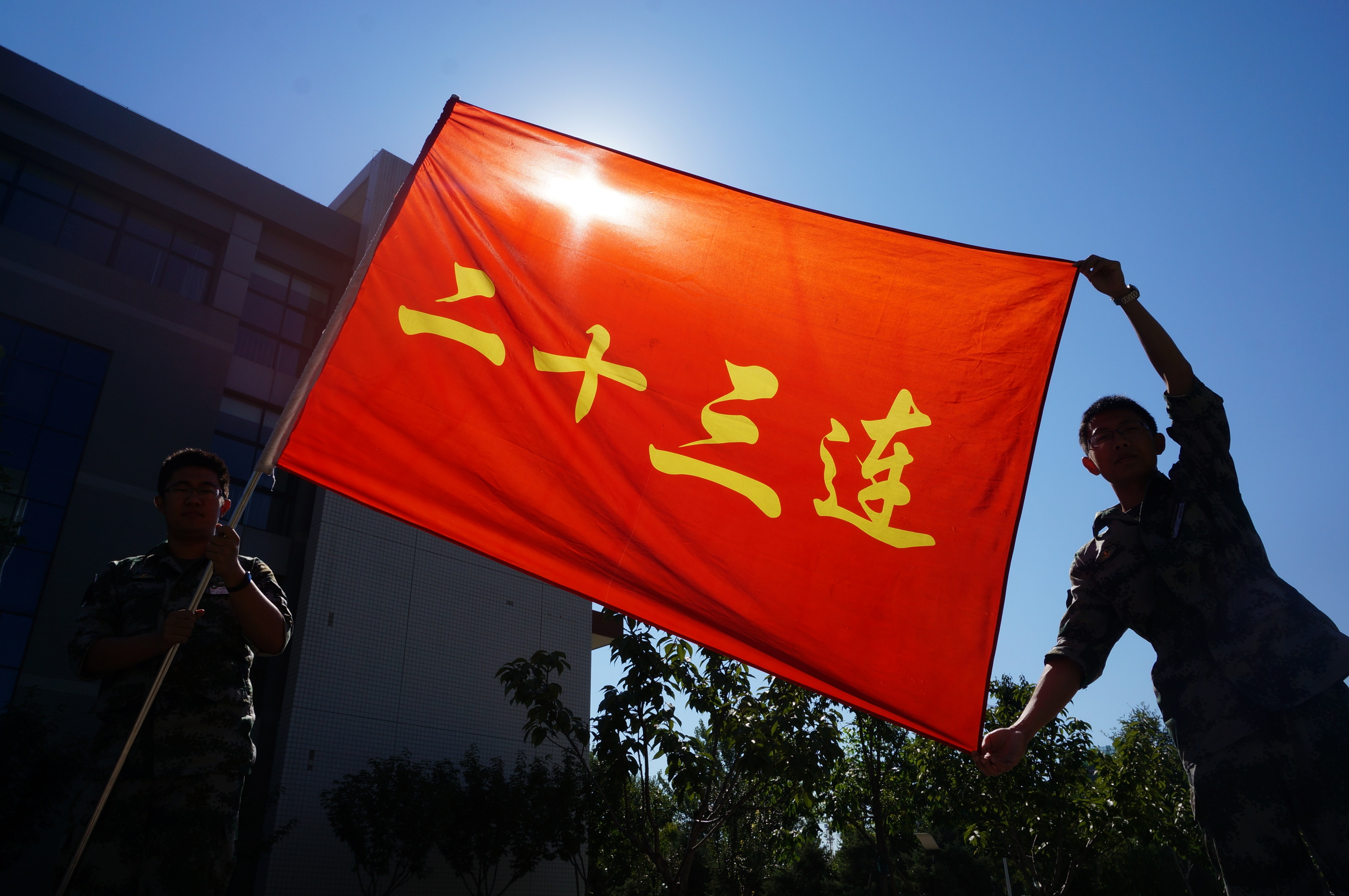 看!在秋风中,我们的连旗猎猎作响,阳光打在上面,闪耀着属于我们青春的辉煌。(摄影:23连)