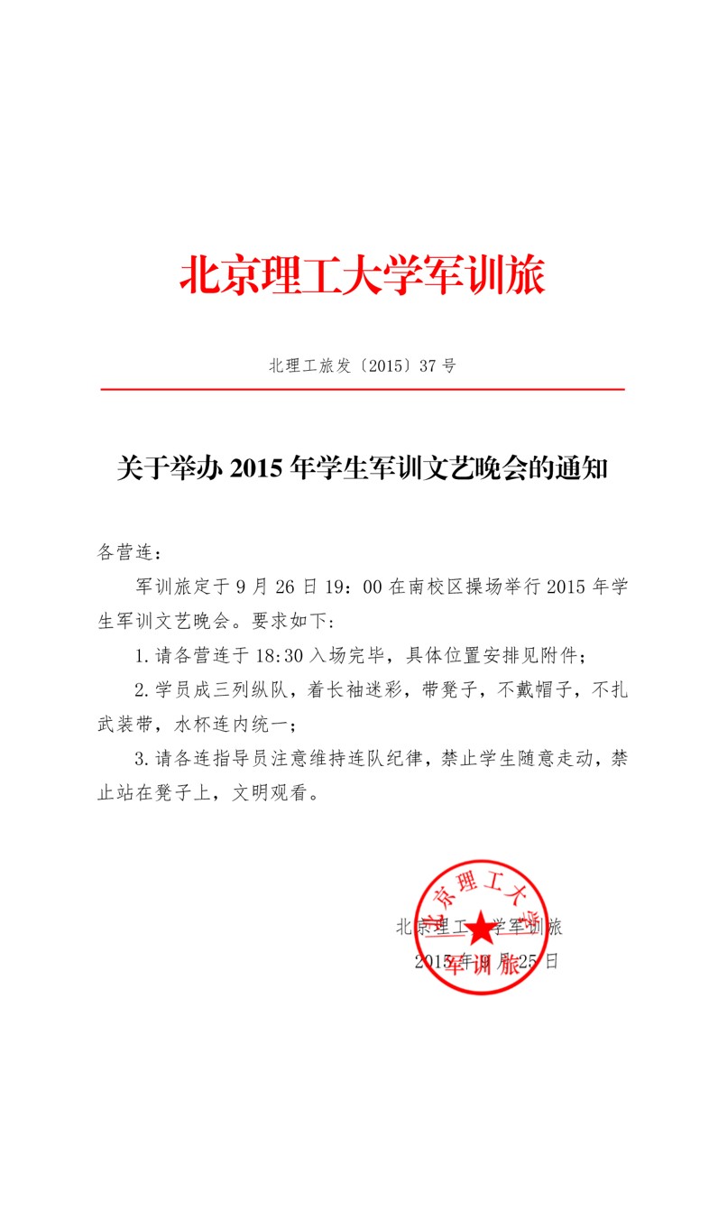 北理工旅发〔2015〕37号:关于举办2015年学生军训文艺晚会的通知