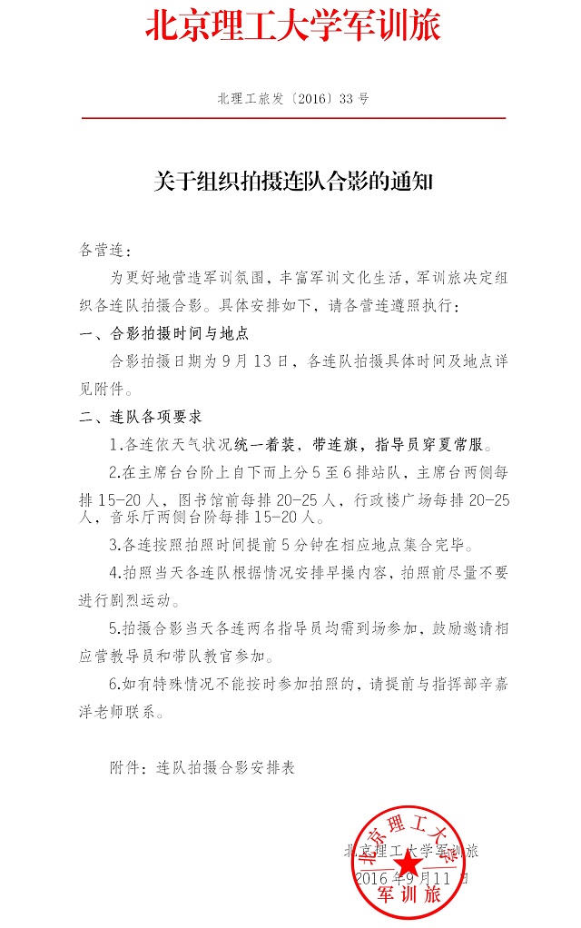 北理工旅发〔2016〕33号:关于组织拍摄连队合影的通知