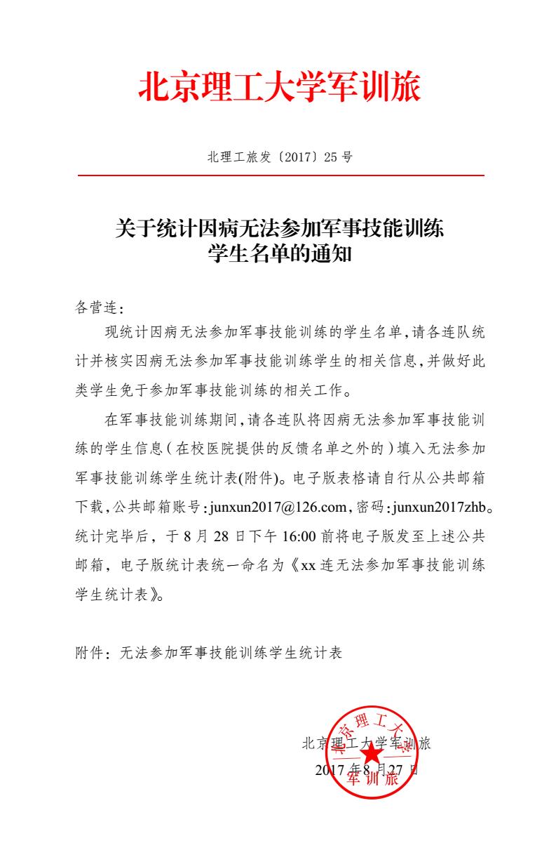 北理工旅发〔2017〕25号:关于统计因病无法参加军事技能训练学生名单的通知