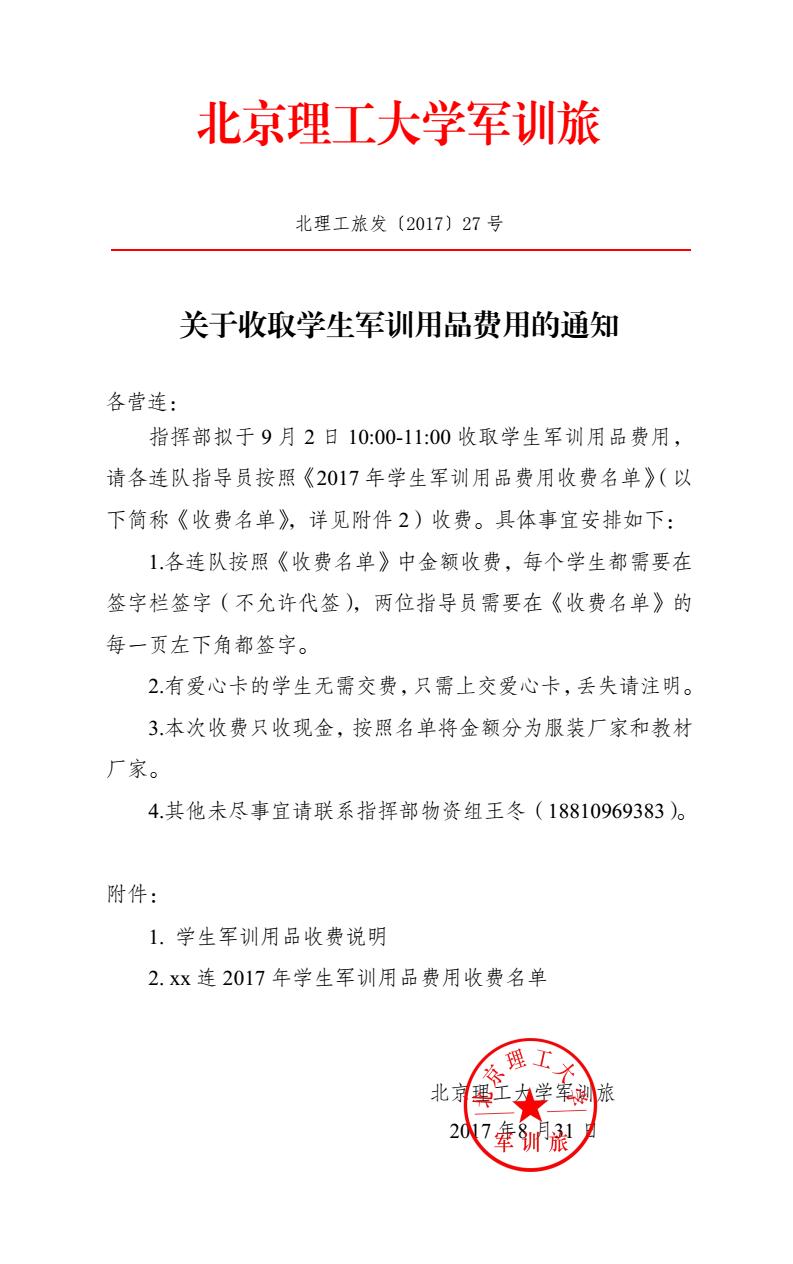北理工旅发〔2017〕27号:关于收取学生军训费用的通知