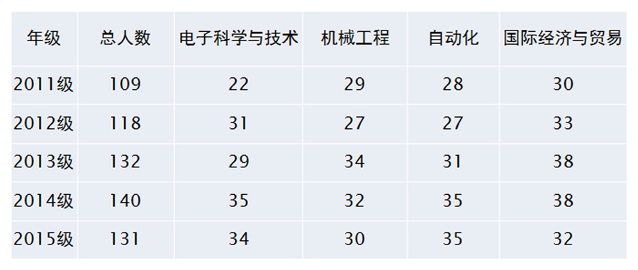 2017年有5个全英文教学专业招生:机械工程、电子科学与技术、电气工程(自动化)、国际经济与贸易、机械电子工程(新)。