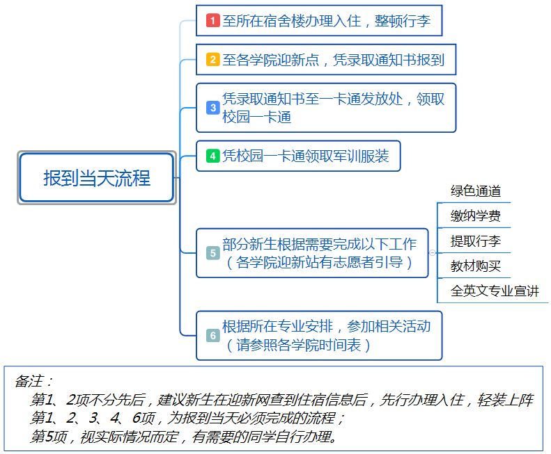 通过网上预报到,新生已经了解了所在宿舍,建议到校后,先到宿舍放下行李,然后轻装上阵,前往校区主迎新站,在学院报到点,将会有志愿者引导新生完成其他报到工作,并告诉新生报到期间日程安排和注意事项。
