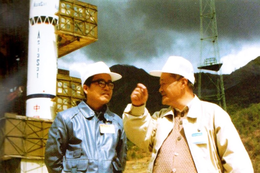 1990年4月,谢光选(右)与航天一院党委书记沈辛荪在发射现场